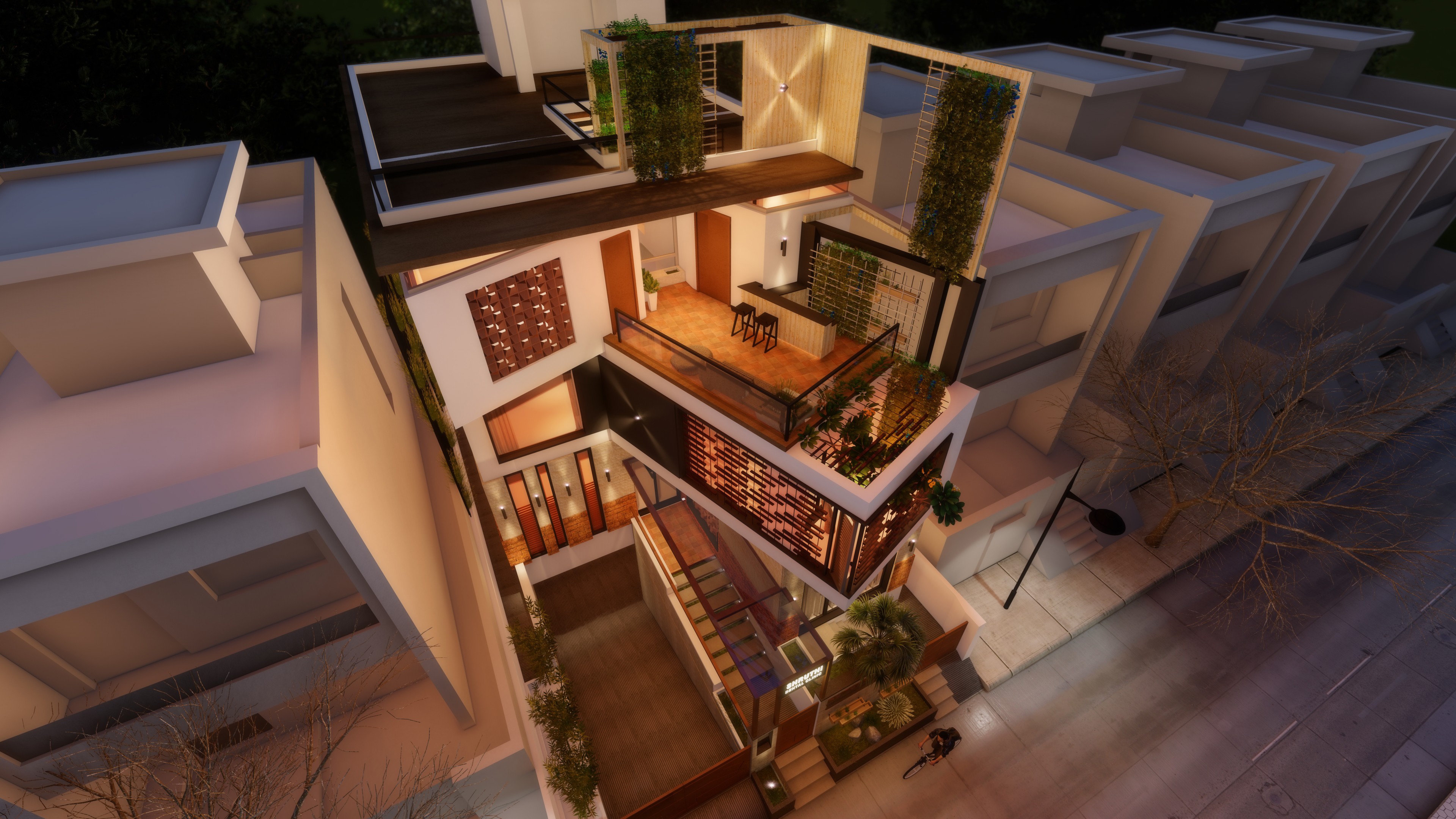 This wasn’t just another doctor’s clinic - A Doctor’s Bubble was envisioned as a calm sanctuary amidst clinical chaos. A mixed-use development that stacks a hospital clinic across two floors with a penthouse-style residence above, the design breaks away from the monotony of typical healthcare architecture. The facade plays with angles - dynamic yet minimal - where whites dominate the palette, creating a sense of purity, clarity, and calm. Custom MS handrails, terracotta breeze blocks, and indoor water bodies elevate the spatial experience with a serene, almost meditative quality. The elevation is treated as an architectural expression in itself - an interplay of straight and angled lines that carry through in the staircase, lighting design, and room orientation. It's an ode to light, clean geometry, and a better healthcare experience for both doctor and patient.